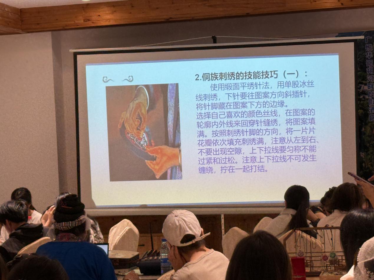 非遗传承人讲解侗绣制作过程、学生体验侗绣