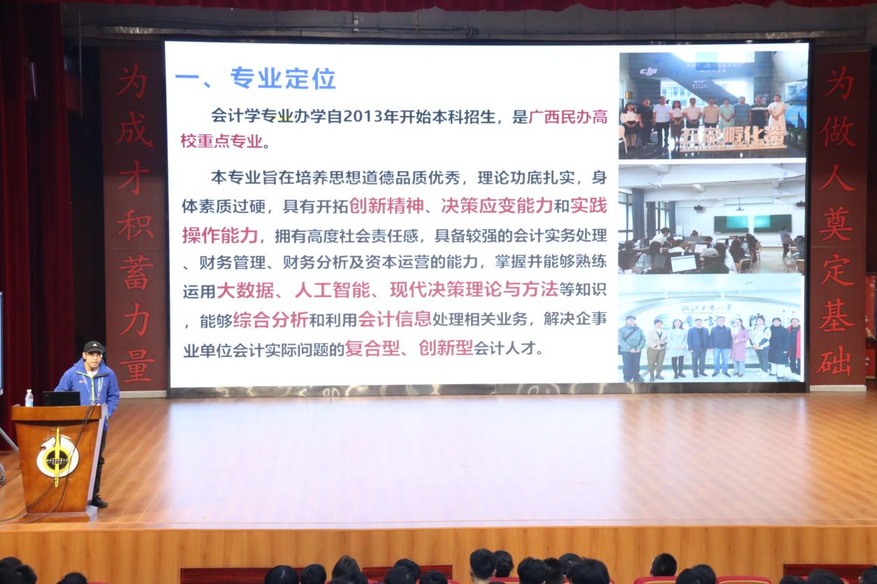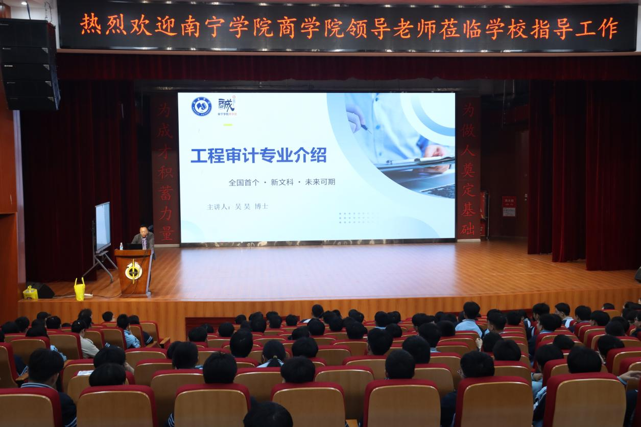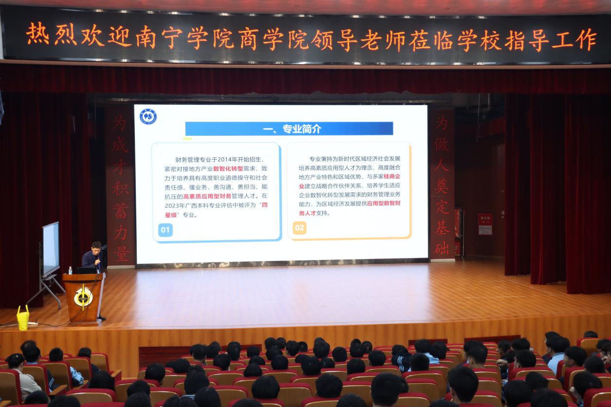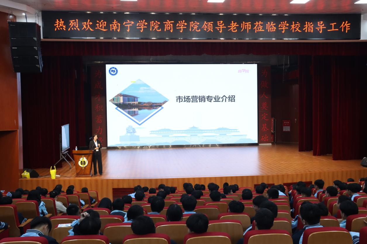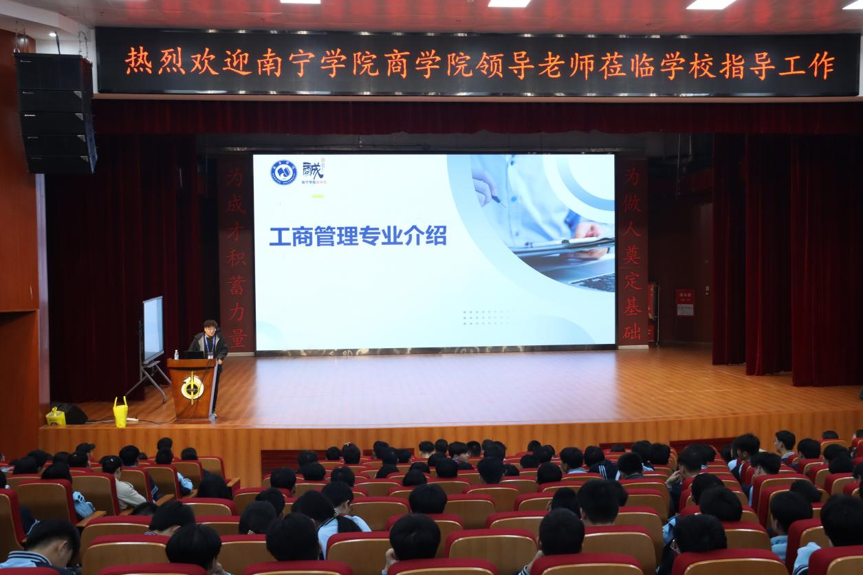 随后,招生宣传专题宣讲会在学校礼堂举行,数百名高三学子到场聆听。宣讲现场,通过播放南宁学院形象宣传片,直观展现了学校的校园环境、办学实力与育人氛围,让在场师生对学校有了初步的立体认知。蒙永亨为学生详细介绍了南宁学院的整体情况、专业设置及招生政策。商学院各系教师代表依次登台,聚焦会计学、财务管理、工商管理、工程审计和市场营销专业课程设置、人才培养模式,以及毕业生的就业去向和发展前景等内容展开精准宣讲。